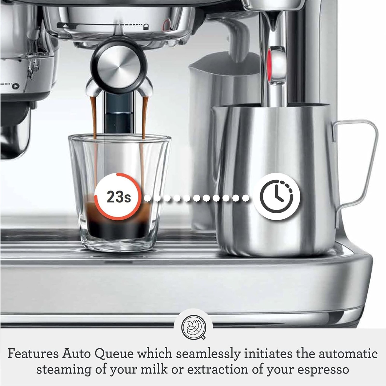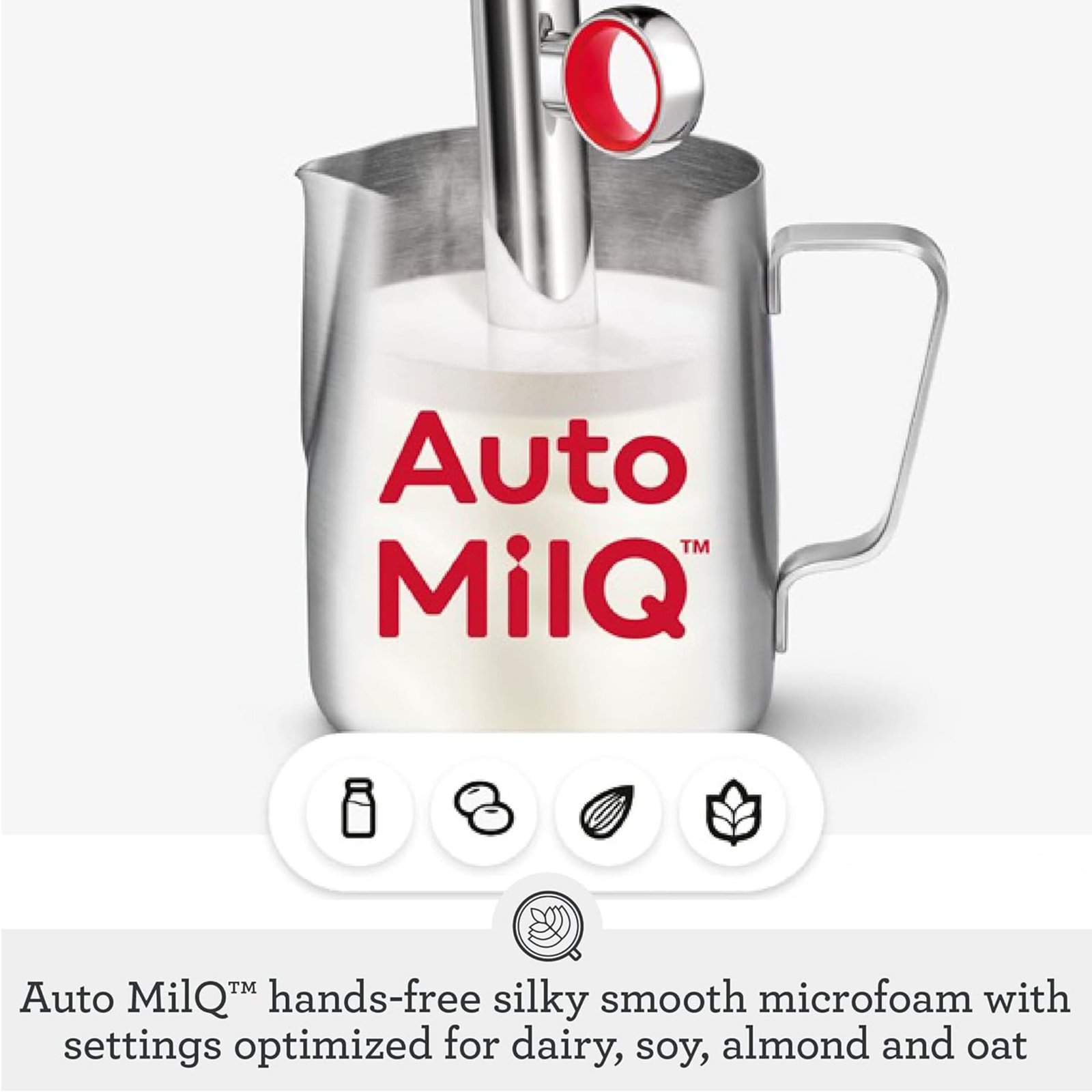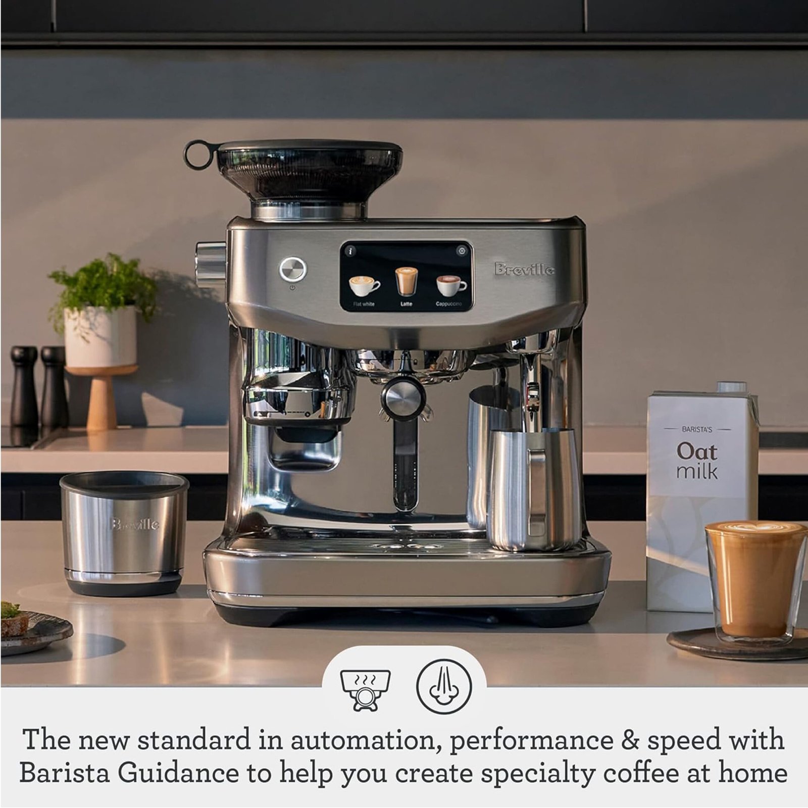 The new standard in automation, performance & speed. Auto grind, dose & tamp into the professional-style 58 mm portafilter and use Barista Guidance to help you create specialty coffee at home. Auto MilQ delivers silky microfoam hands-free, with settings optimized for dairy, soy, almond and oat, plus Auto Queue your milk to start automatically once extraction has finished. The new highly responsive touch screen features pre-programmed café favorites including new Cold Brew & Cold Espresso. All powered by the ThermoJet heating system.