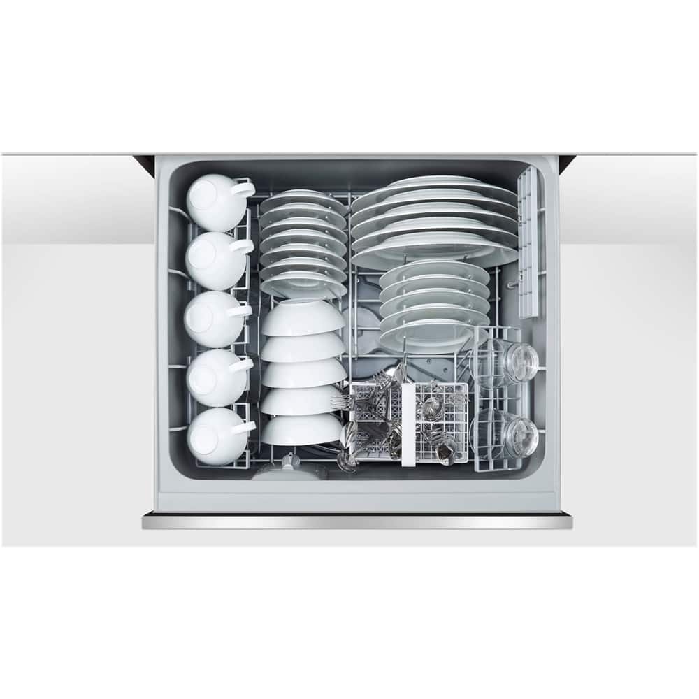 Achieve sparkling clean plates and silverware with this Fisher & Paykel double DishDrawer dishwasher. The two sections can be used independently to keep delicate crystal separate from pans needing heavy scrubbing, and the built-in water softener improves results. This Fisher & Paykel double DishDrawer dishwasher holds up to 14 place settings on adjustable shelving.