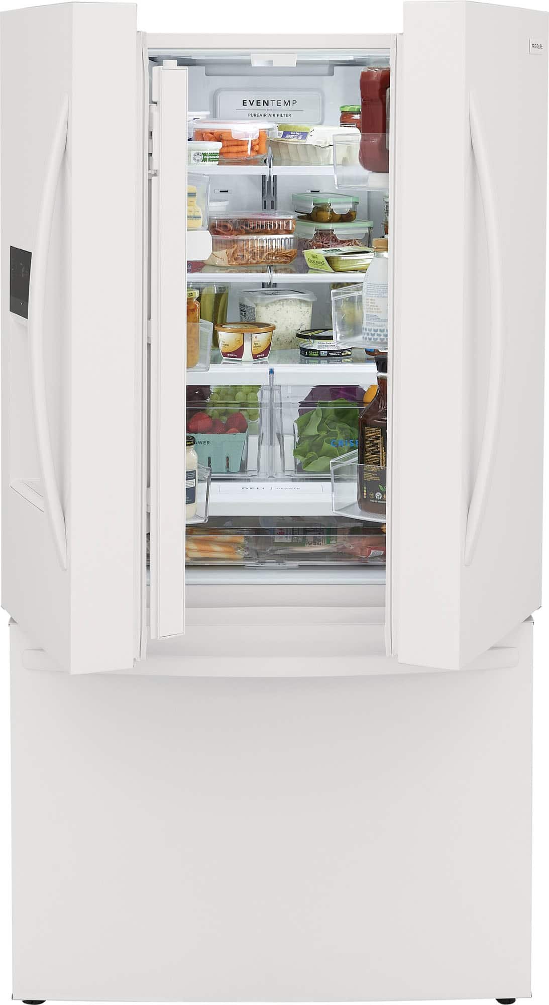 This Frigidaire French door refrigerator helps keep fruits and vegetables fresh longer with CrispSeal crispers which blocks dry air from entering your crisper. Easily stay organized with a full width deli drawer & Large door bin storage.