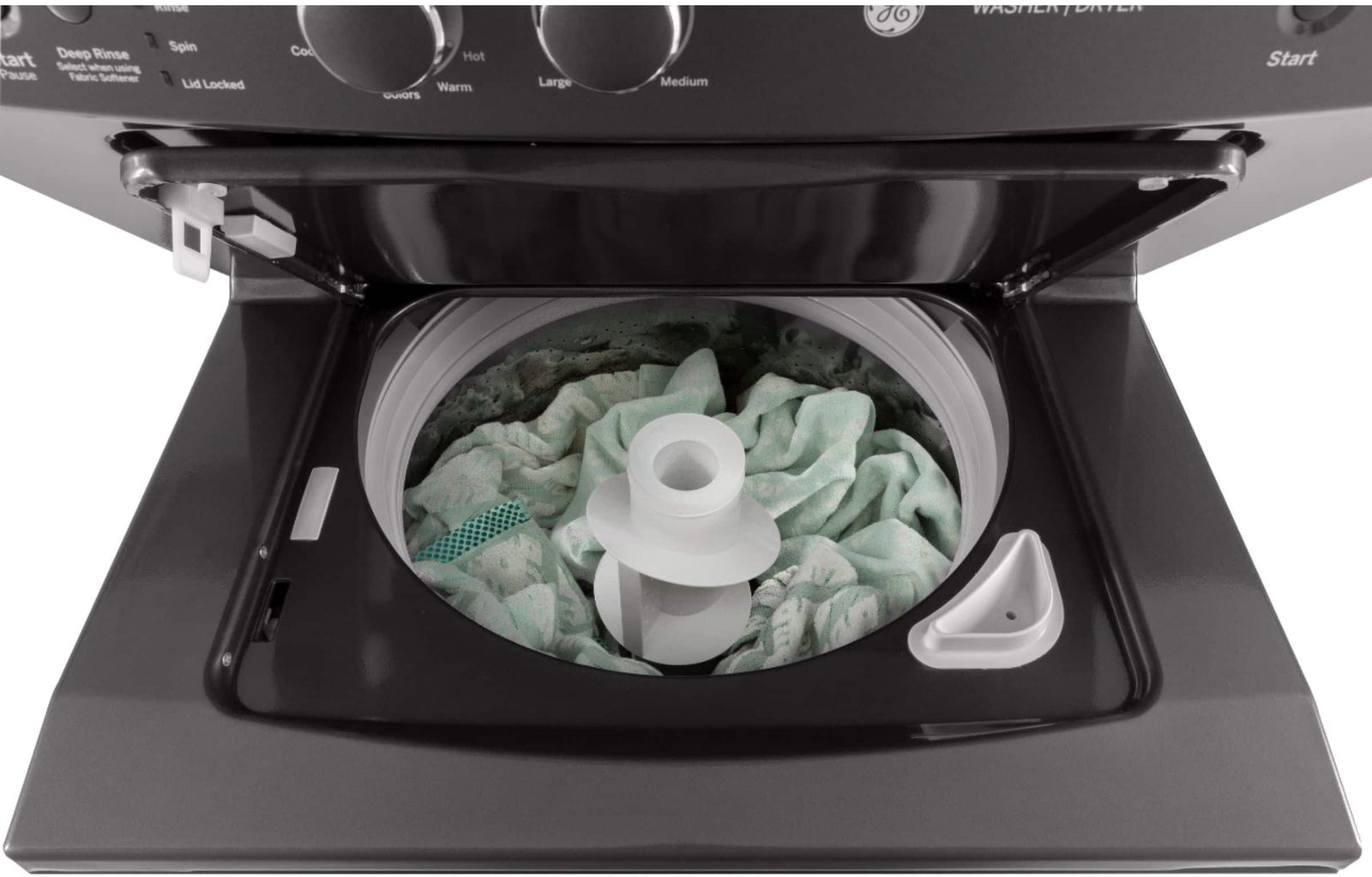 This GE laundry center combines a 3.8 cu. ft. top load washer and 5.9 cu. ft. electric dryer in one stacked unit designed to save floor space.