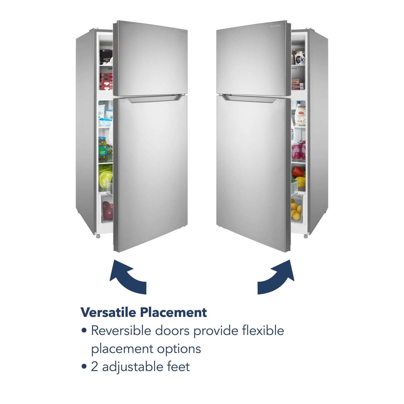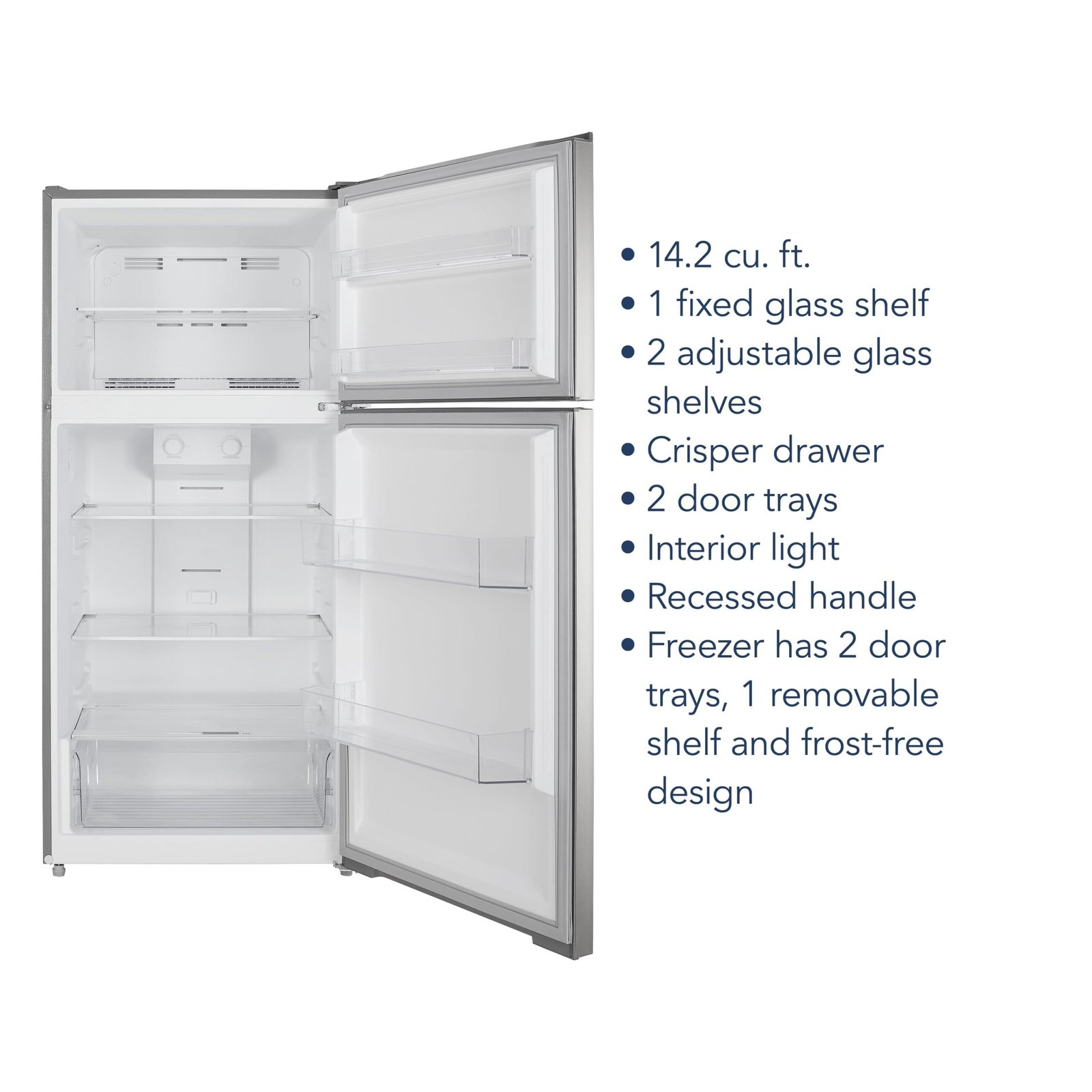 The Insignia 14.2 Cu. Ft. Top-Freezer Refrigerator has a separate top freezer compartment with plenty of dedicated space to store your frozen treats and keep them organized on shelves or in the door trays. The fridge has three shelves to organize your food, with two that adjust to fit taller items. Door trays comfortably store your bottles and condiments, even 1-gallon jugs, and the crisper drawer keeps fruits and vegetables fresh. The refrigerator is also internally lit so you can find items easily.