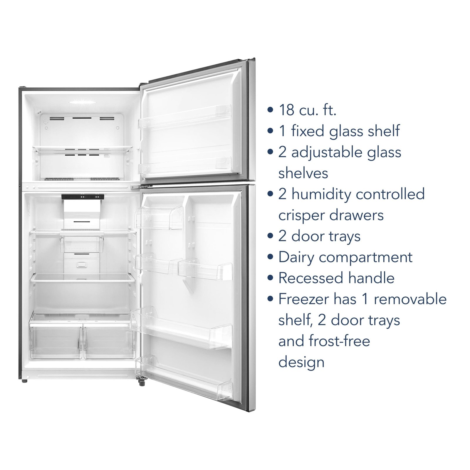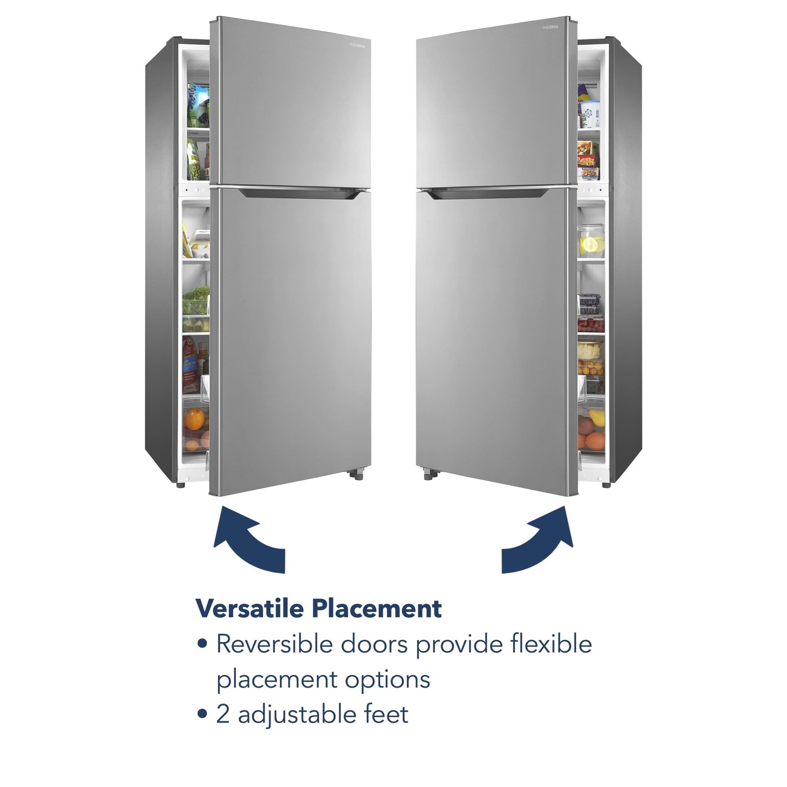 The Insignia 18 Cu. Ft. Top-Freezer Refrigerator has a separate top freezer compartment to store your frozen products and keep them organized on shelves or in the door trays. The fridge has three shelves to organize your food, with two that adjust to fit taller items. Door trays comfortably store your bottles and condiments, even 1-gallon jugs, and the humidity-controlled crisper drawers keep fruits and vegetables fresh. The refrigerator is also internally lit so you can find items easily.