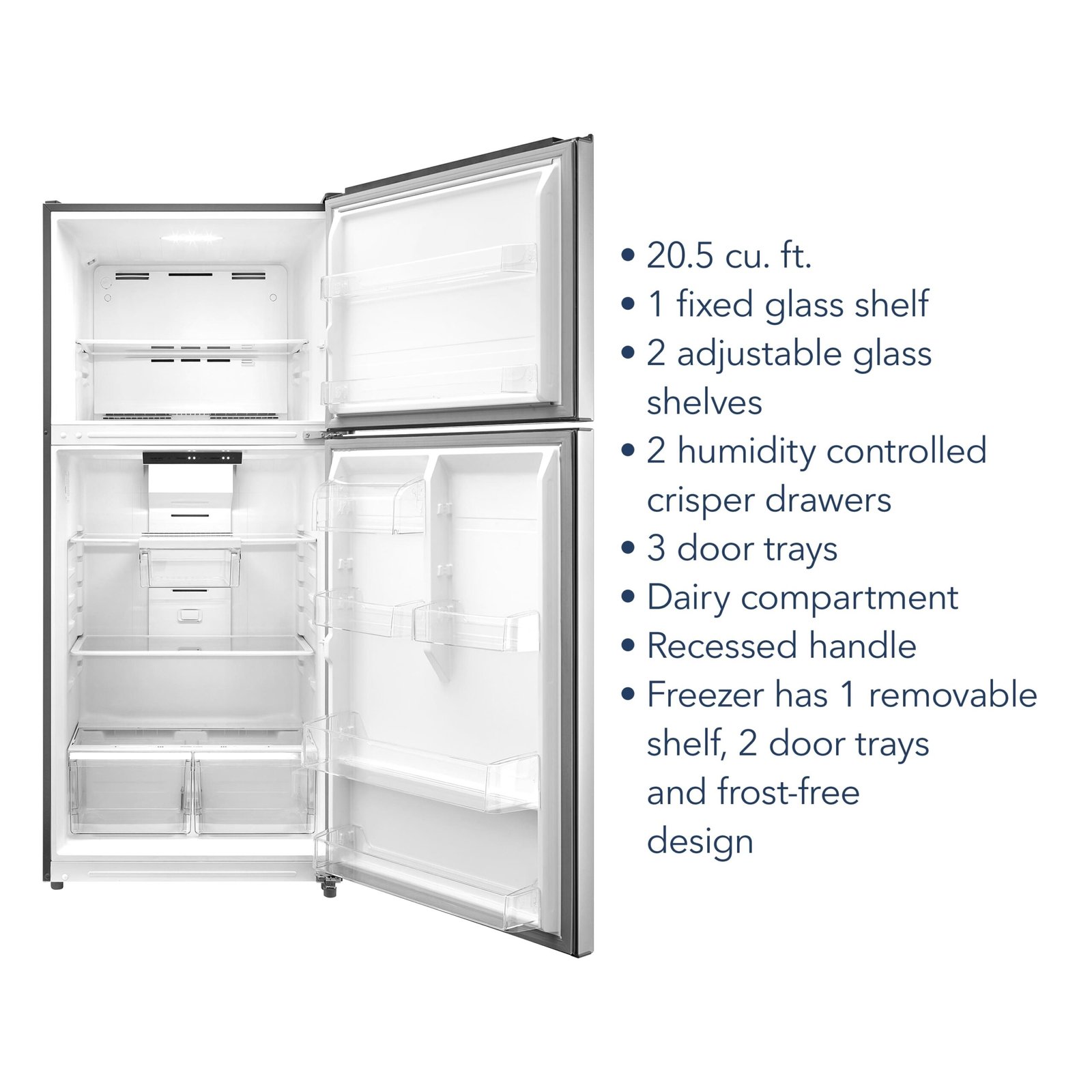 The Insignia 20.5 Cu. Ft. Top-Freezer Refrigerator has a separate top freezer compartment to store your frozen treats and keep them organized on shelves or in the door trays. The fridge has three shelves to organize your food. Door trays comfortably store your bottles and condiments—even gallon jugs—and the humidity-controlled crisper drawers keep fruits and vegetables fresh. The refrigerator and freezer are also internally lit so you can find items easily.