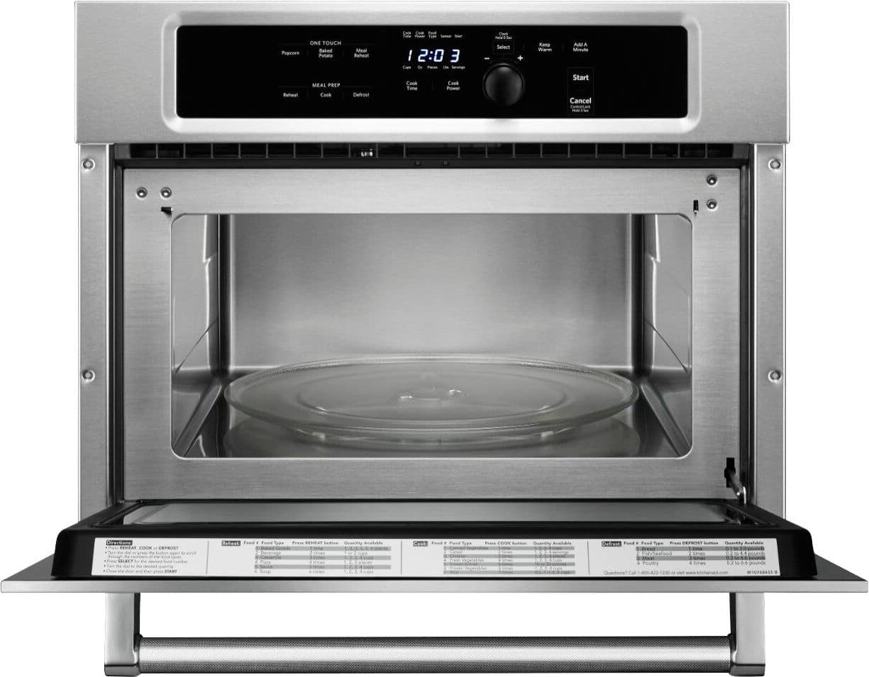 KitchenAid Built-In Microwave: Heat up snacks for your family with this 1.4 cu. ft. microwave, which features 7 one-touch settings and sensor cooking for easy operation. The removable turntable offers flexibility for large dishes, and a child lock protects against unsupervised use.