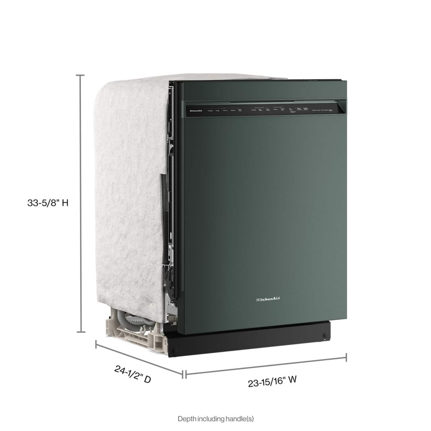 This KitchenAid dishwasher combines front controls, a stainless steel tub, and a third level jet rack with quiet 41 dBA operation in a Juniper finish.