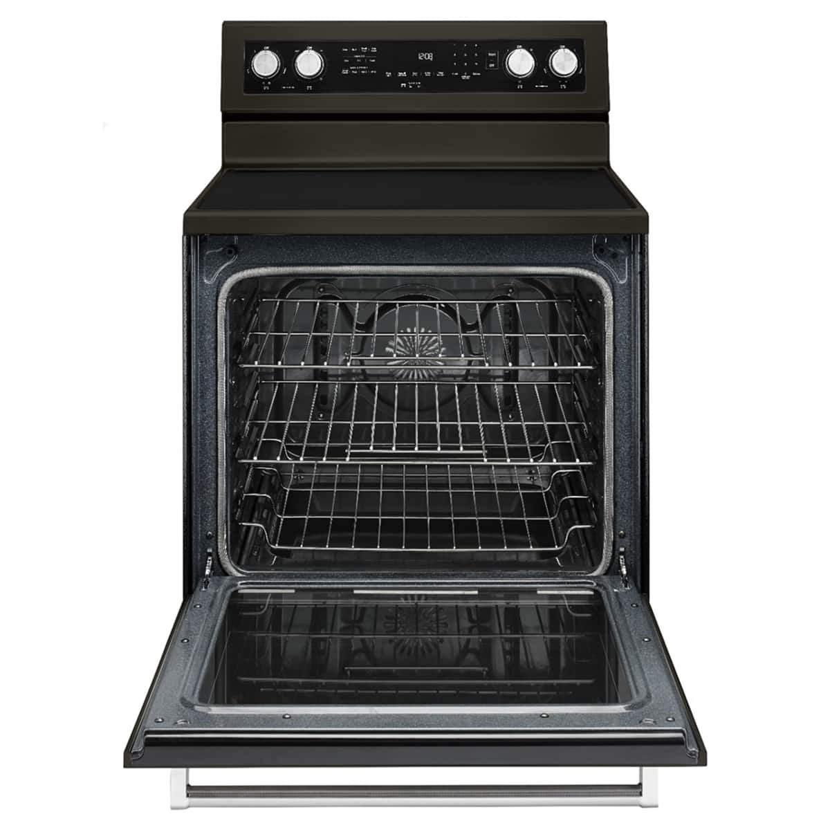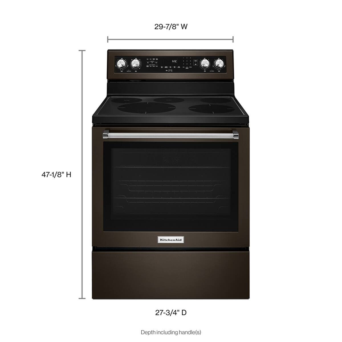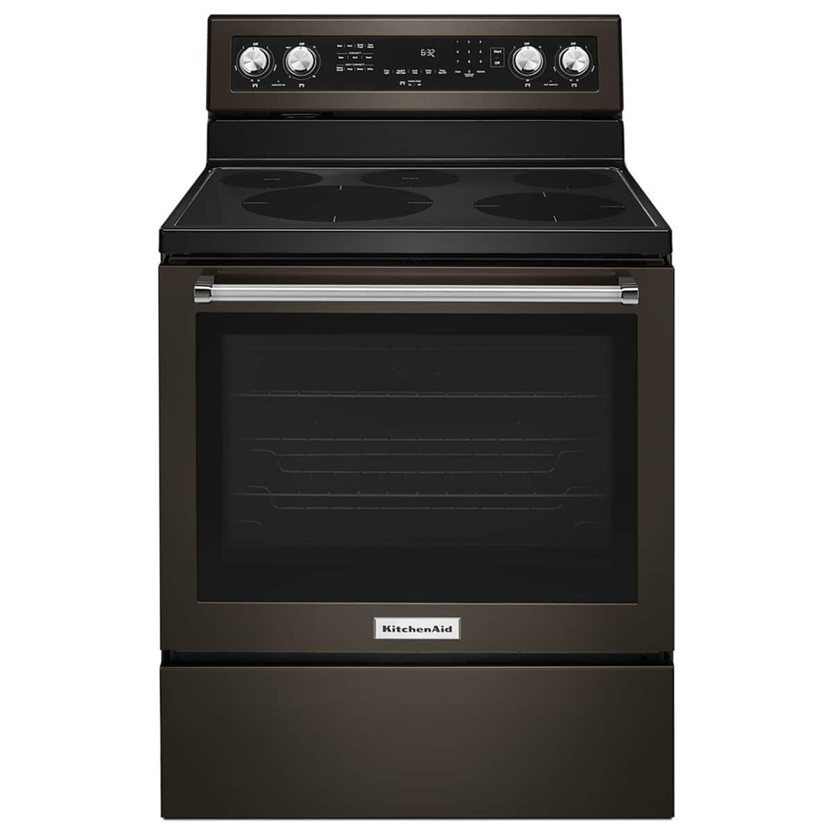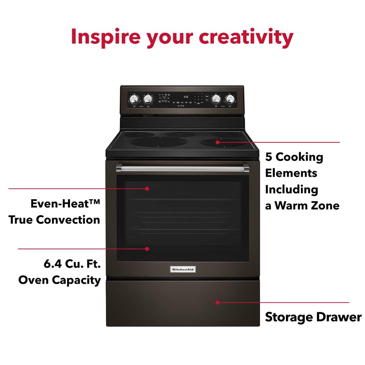 This KitchenAid electric range combines 6.4 cu. ft. capacity, convection cooking, self-cleaning in a Black Stainless Steel finish.