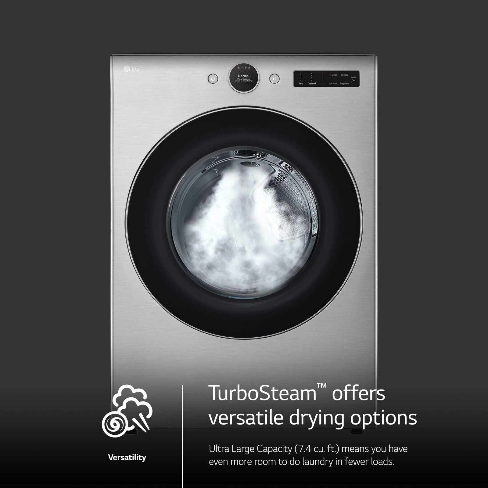 This LG appliance combines 7.4 cu. ft. capacity, smart features, steam support in a Graphite Steel finish.