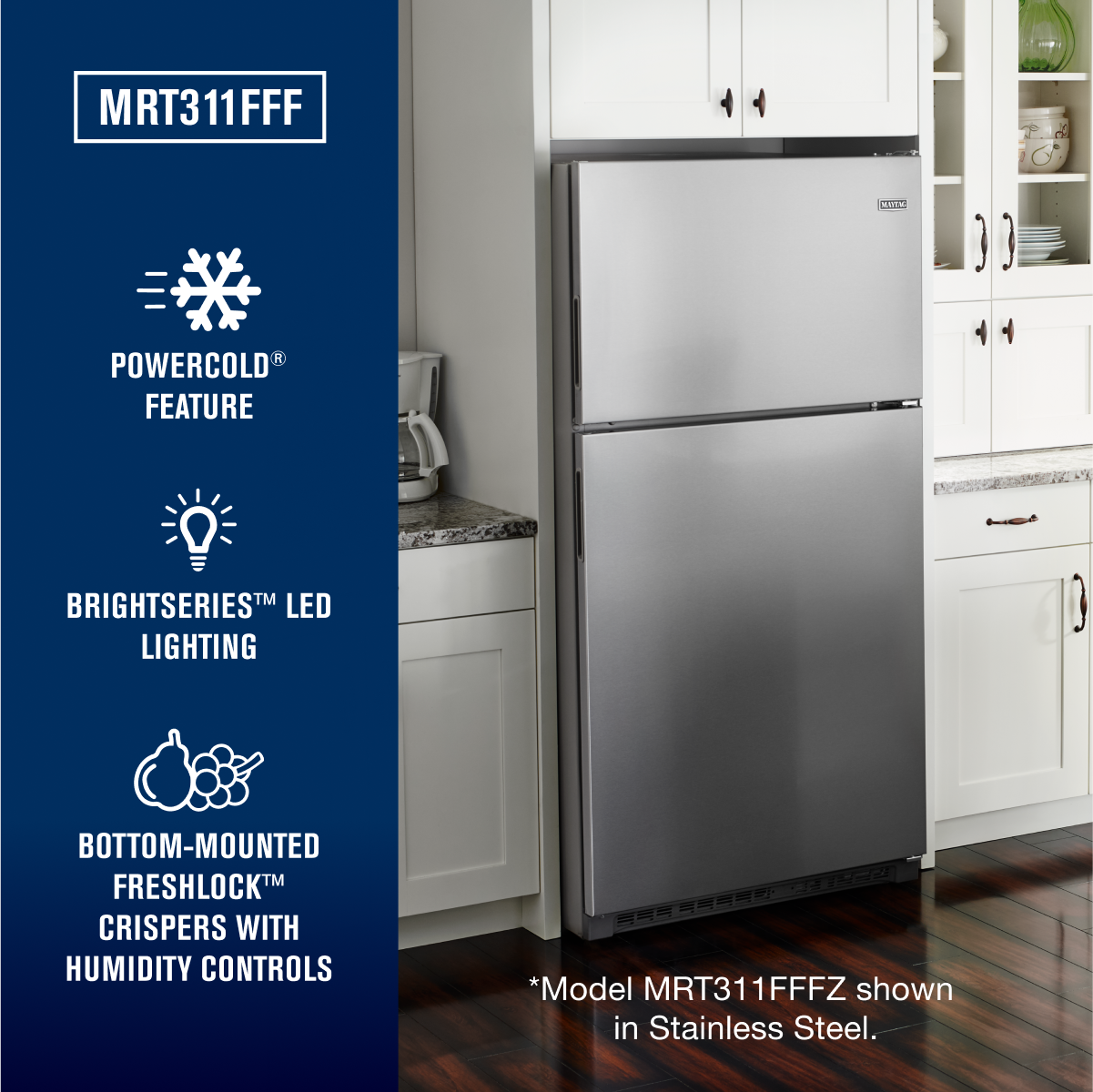 Maytag® top-freezer refrigerators are built to hold the cold with features like the PowerCold® feature that chills down the refrigerator to help keep everything cool with the touch of a button—even if the whole family’s been browsing with the door open. Plus, fingerprint resistant stainless stainless steel keeps this fridges looking great. Inside this 21 cu. ft. model you’ll also find the BrightSeries™ LED lighting. It casts a bright, white light and uses less energy than incandescent bulbs