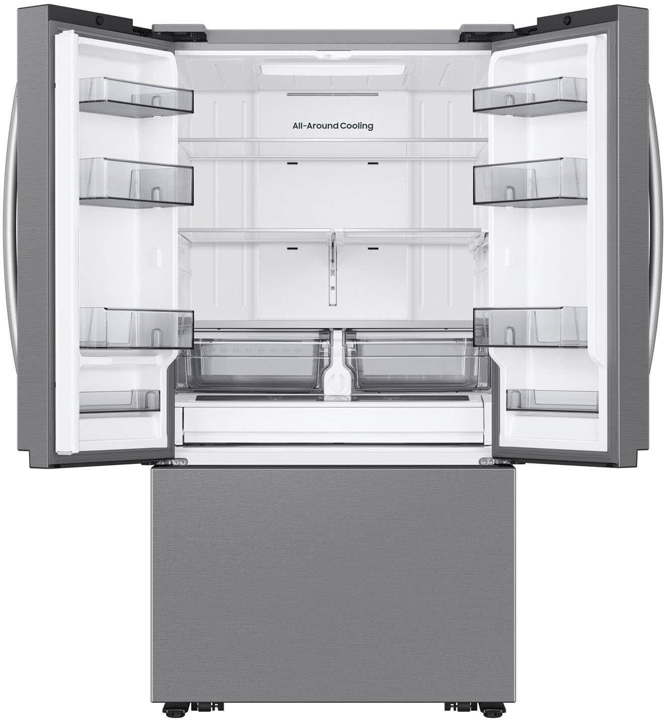 Samsung Mega Capacity 3-Door French Door refrigerator features 32 cu. ft. capacity, Dual Auto Ice Maker and a modern design. Store more groceries, including big and bulky items. The Dual Auto Ice Maker makes two types of ice – cubed, or Ice Bites that chill your drink faster.