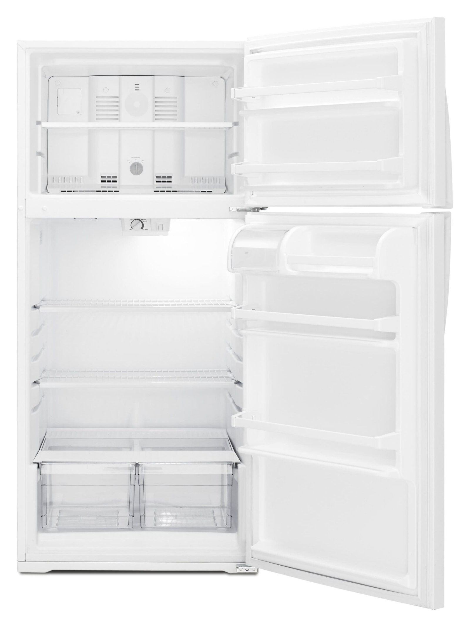 Chill groceries with this Whirlpool WRT134TFDW 14.3 cu. ft. top-freezer refrigerator, which features interior temperature control dials for easy adjustments. Three shelves and a deli meat drawer help organize the storage space.