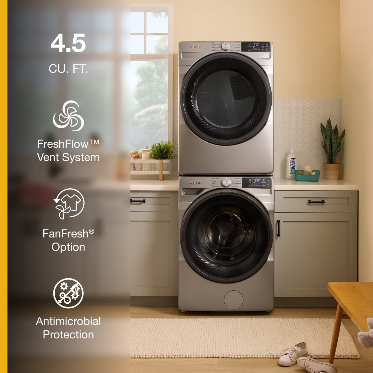 This Whirlpool front load washer combines 4.5 cu. ft. capacity, ENERGY STAR efficiency, smart connectivity, and the FreshFlow vent system for households that want a modern washer with stronger freshness support.