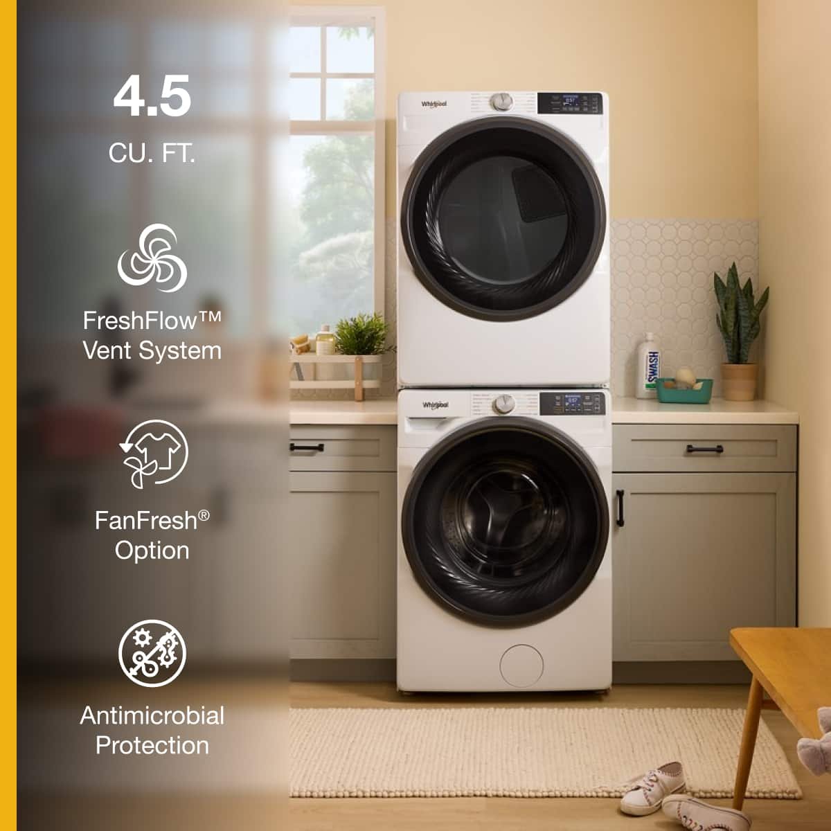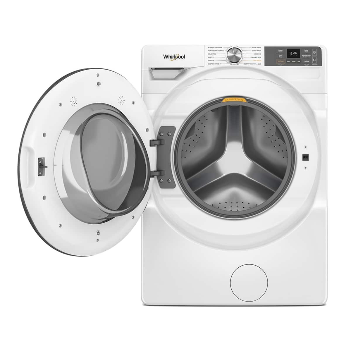 Whirlpool built this washer around the FreshFlow vent system, a feature set designed to help tackle one of the biggest front-load pain points: lingering moisture after the cycle ends. By combining the FanFresh option, Dry Drum cycle, and antimicrobial protection, the washer aims to stay fresher with less manual intervention. That makes it especially attractive for buyers who want front-load efficiency and fabric care but do not want to babysit the door and gasket after every load. It is built around easier everyday ownership.