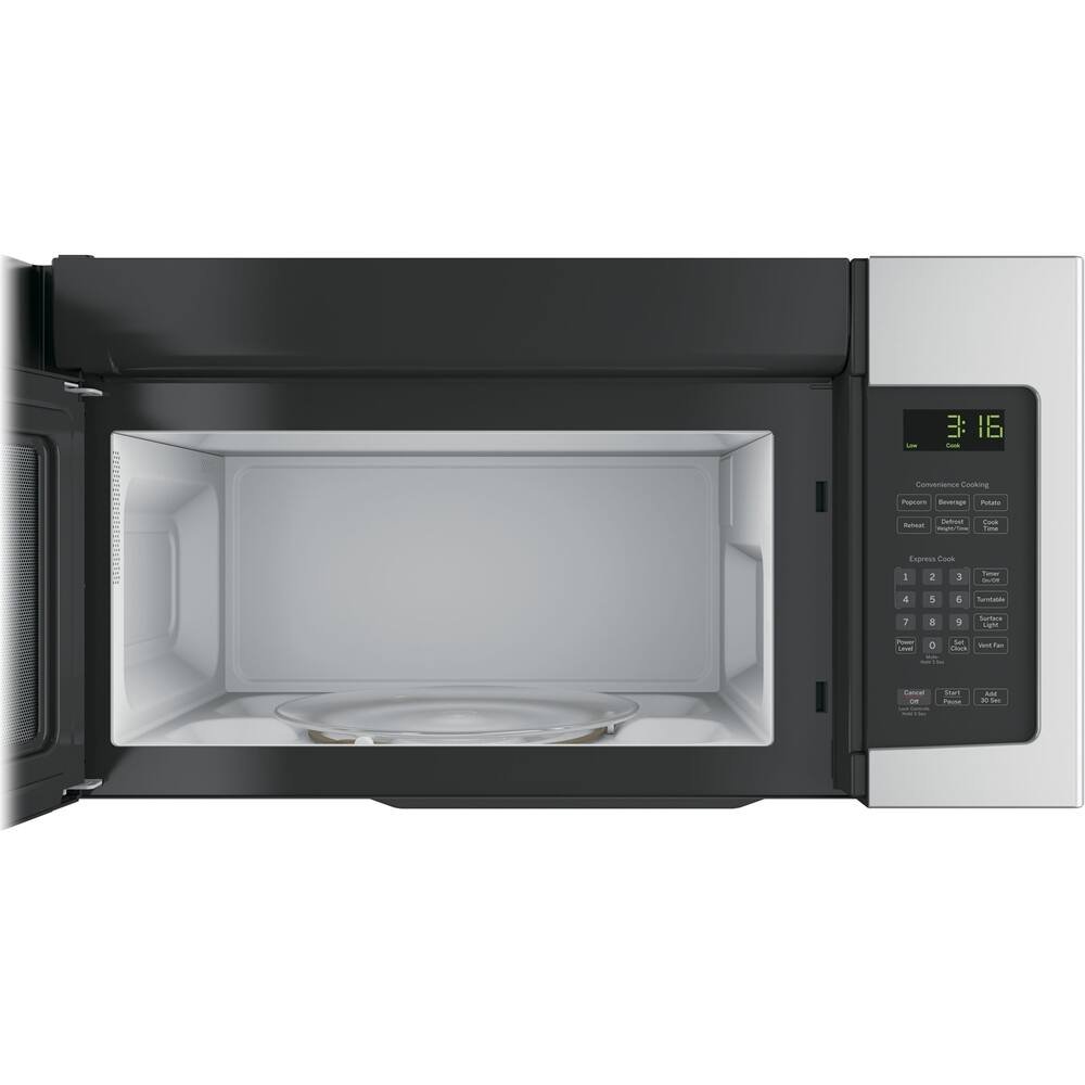 This GE over-the-range microwave has Express Cook options and a turntable with on/off control. This 950W full-size microwave features convenience cooking controls, along with auto and time defrost and an add-30-seonds function. With a two-speed venting system, this GE over-the-range microwave oven eliminates odors, steam and smoke for a pleasant cooking experience.
