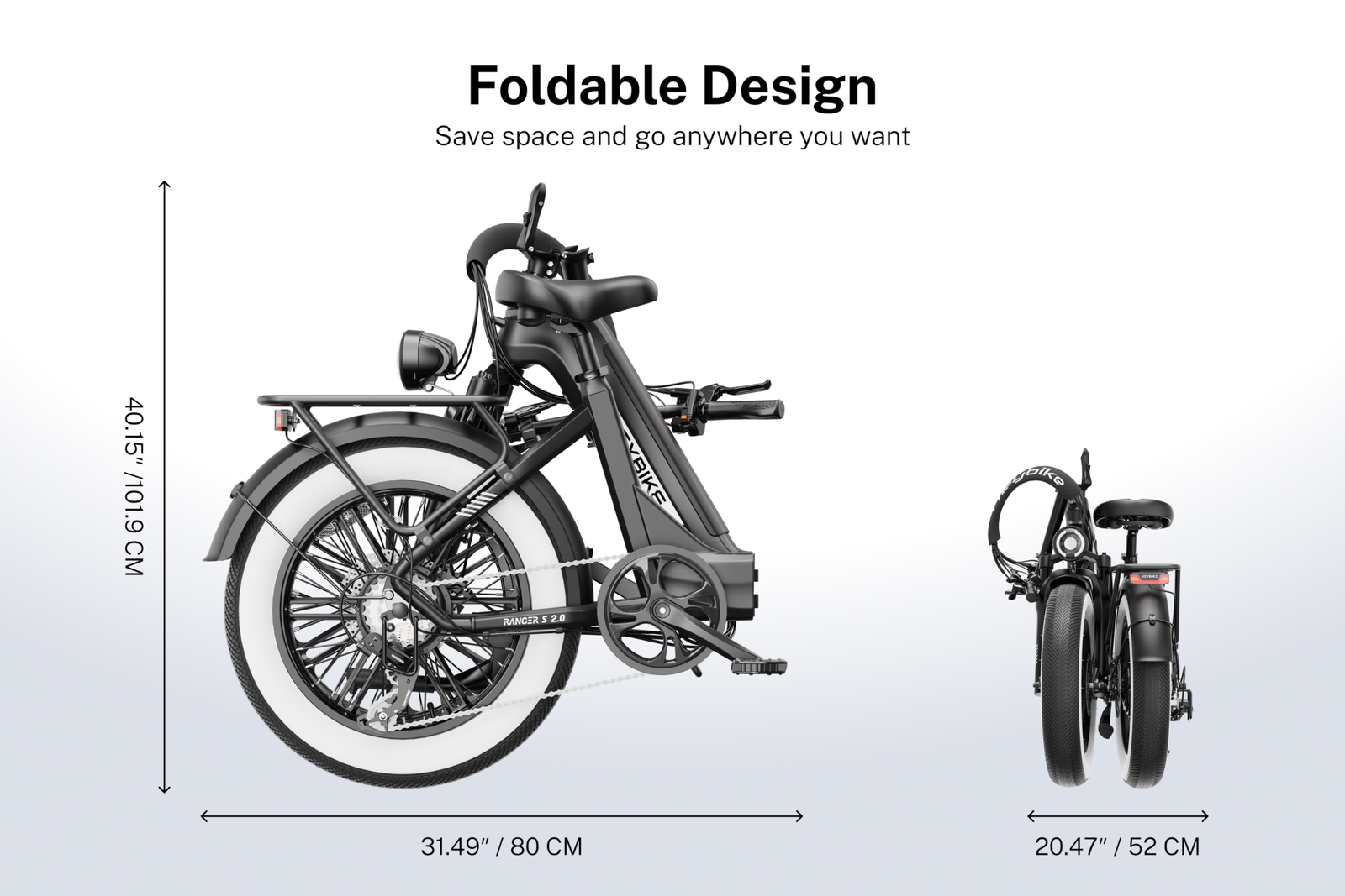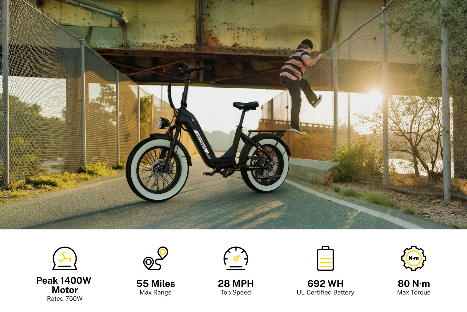 Ranger S 2.0 E-Bike: Premium Power, Unbeatable Comfort & Smarter Safety. Built for riders who refuse to compromise, this fully-loaded electric bike combines 55-mile range, 1400W peak power, and pro-grade features missing on budget models. Experience: Thumb throttle & 32-pulse sensor for ultra-smooth acceleration. Hydraulic suspension + plush saddle that erase bumps. Full lighting system with brake lights (unlike basic competitors)…all wrapped in head-turning whitewall tires. “Where performance meets peace of mind – without the premium price tag.”