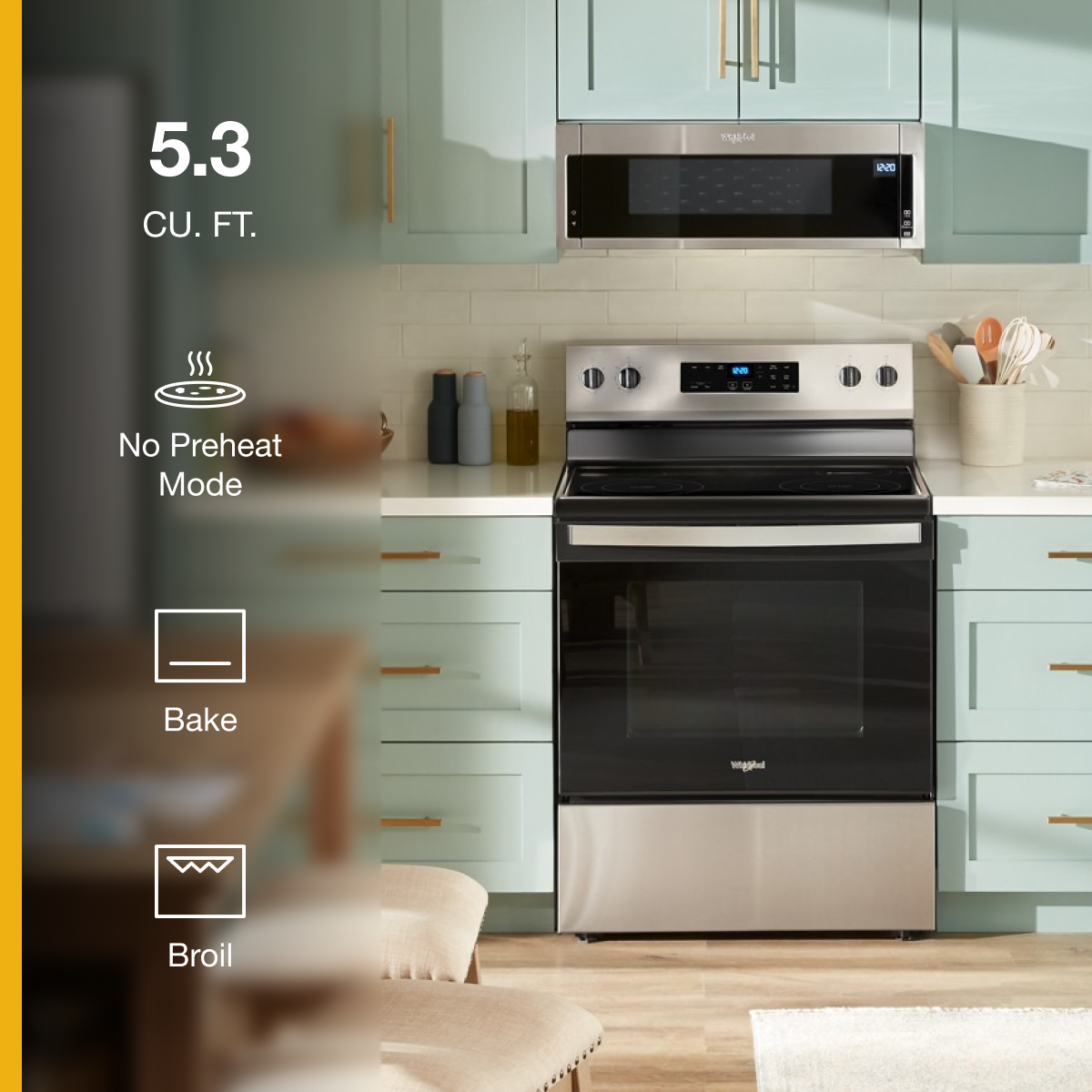 Make the most of your time in the kitchen with this Whirlpool 30 inch electric range, featuring dual electric burners and No Preheat Mode. This 5.3 cu ft conventional oven with Broil helps you add a toasty twist or melty magic to family classics, and features a built-in temperature sensor to help the oven Bake evenly. Plus, boil 40% faster* with two FlexHeat™ Dual Radiant Elements. *When comparing the 9″ element to the 6″ element on the same unit.