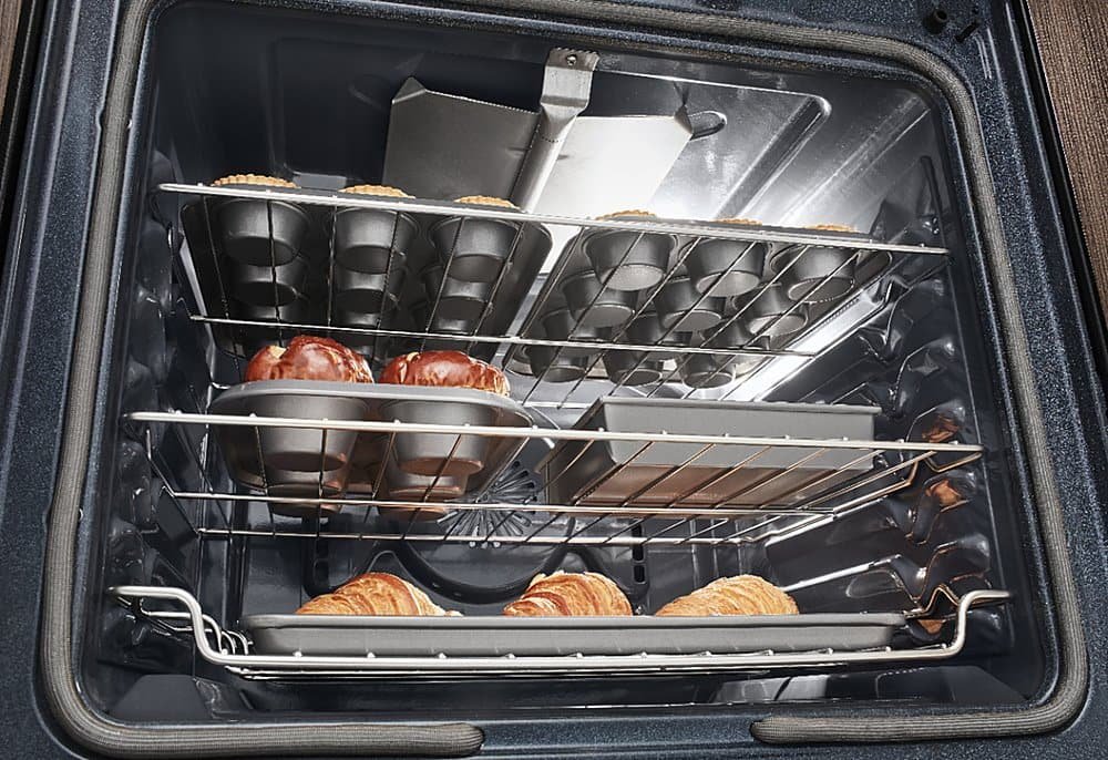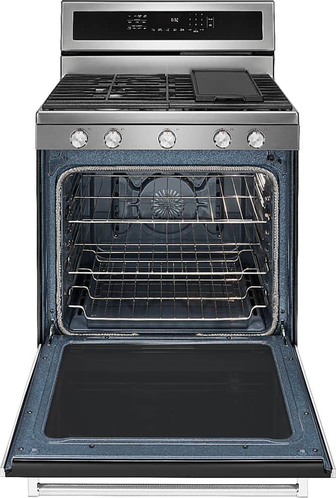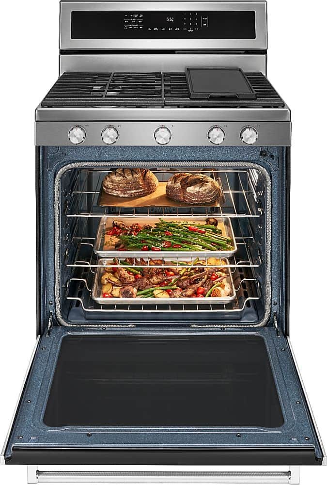 This versatile gas freestanding range produces flawless cooking results with Even-Heat True Convection. The unique bow-tie design and convection fan ensure the inside of the entire oven is heated to, and stays at, the perfect temperature. The cooktop has 5 burners ranging from 5,000 to 18,000 BTU, letting you go from a rolling boil to a delicate simmer.