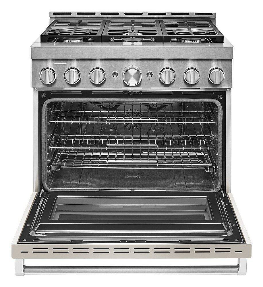 Expand your skills with a 36-inch KitchenAid commercial-style range with 6 burners. This gas range features two versatile 20,000 BTU Ultra Power dual-flame burners with the power and precision needed to successfully sear, simmer, stir-fry, and sauté. The Even-Heat true convection helps you achieve more consistent baking and roasting.