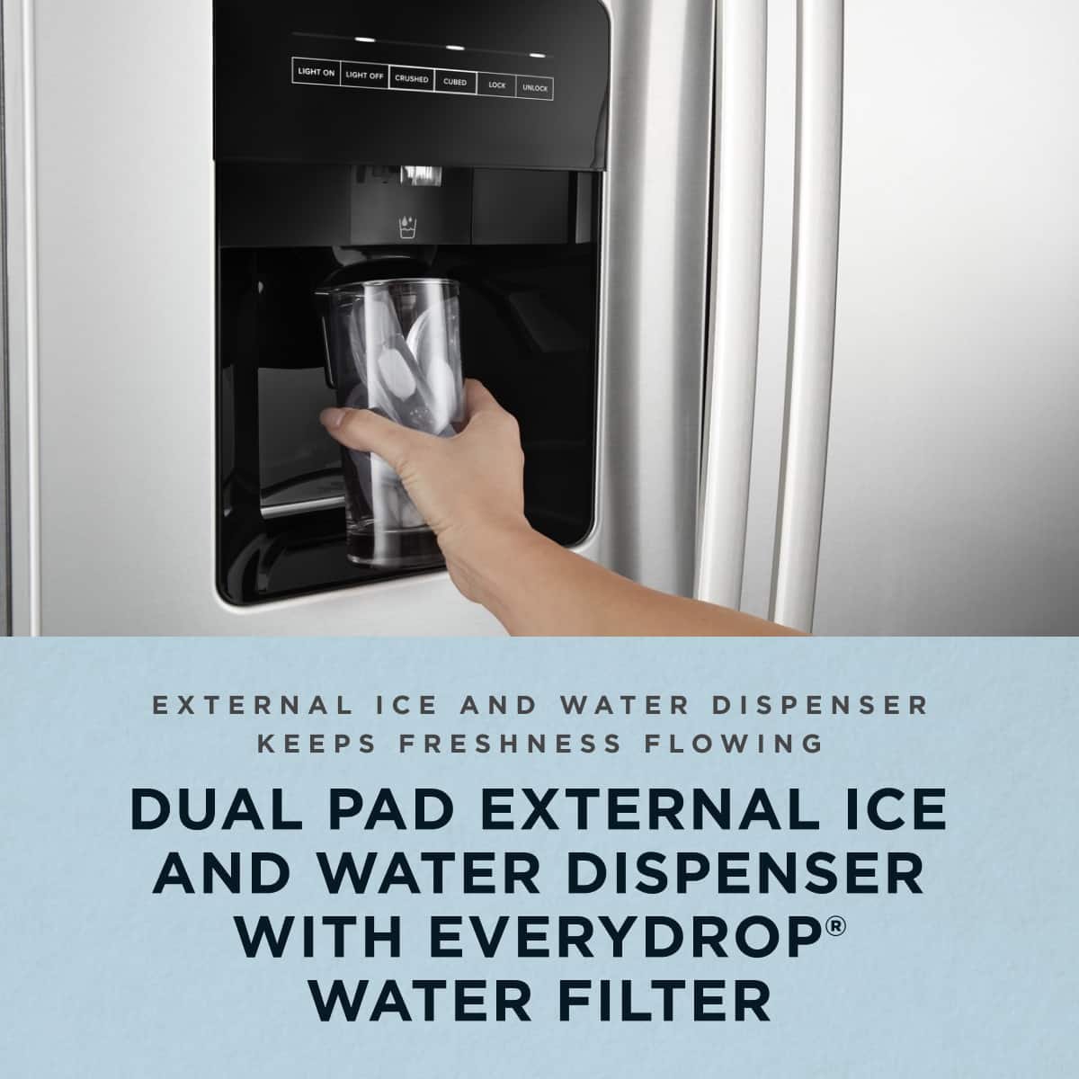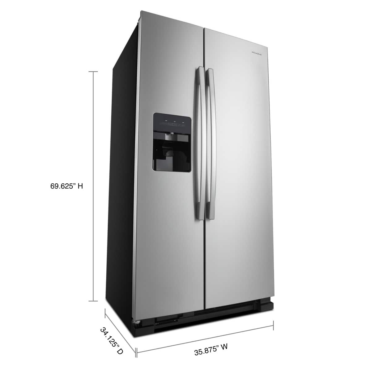 Our 36-inch Amana® Side-by-Side Refrigerator makes food storage simple. This 25 Cu. Ft. refrigerator with ice and water dispenser lets you grab fresh H2O and go using a Dual Pad Dispenser with EveryDrop™ Water Filter. Easily set temps with Electronic Temperature Controls. And big items like juice cartons fit in the Gallon Door Storage Bins to stay in sipping range.