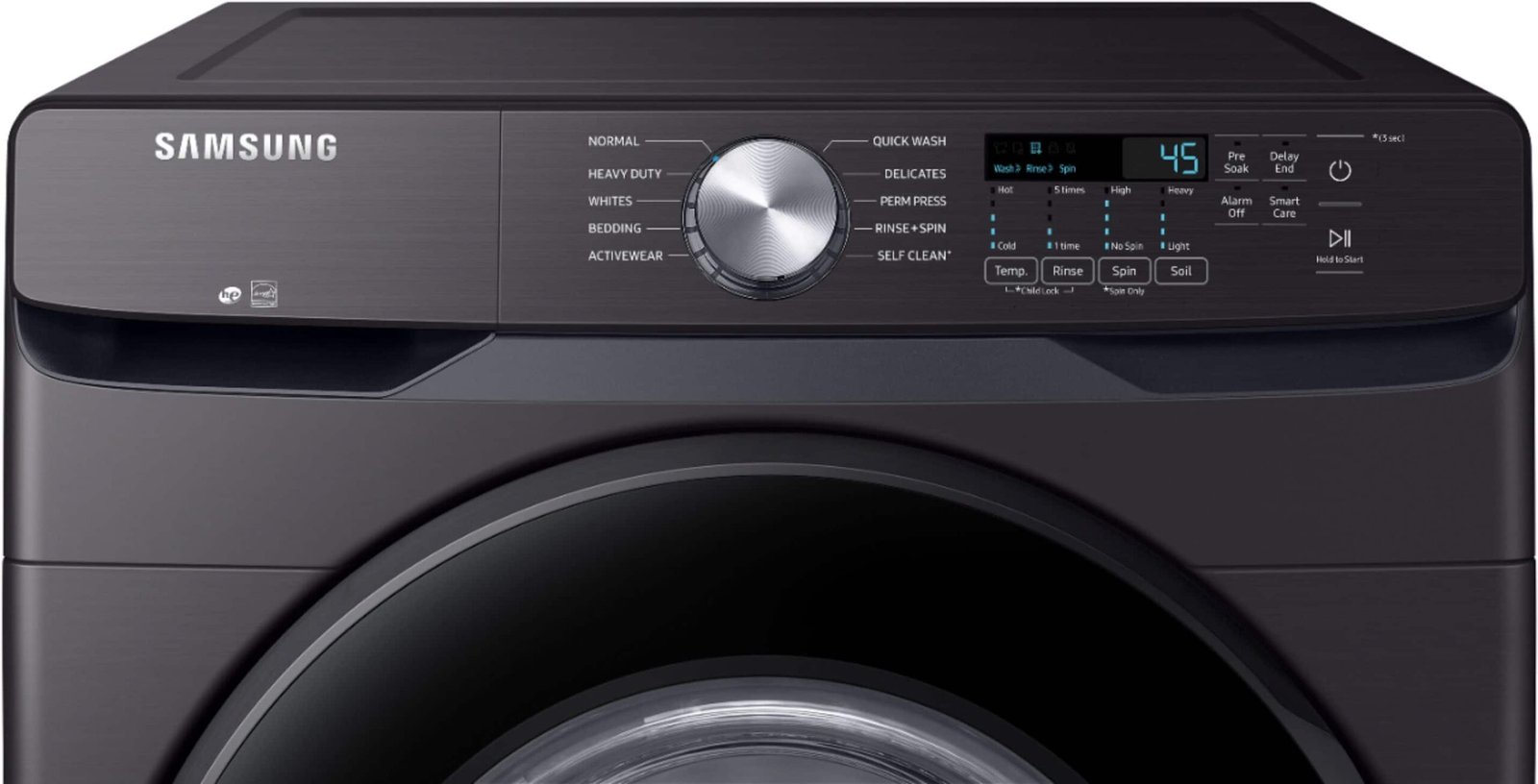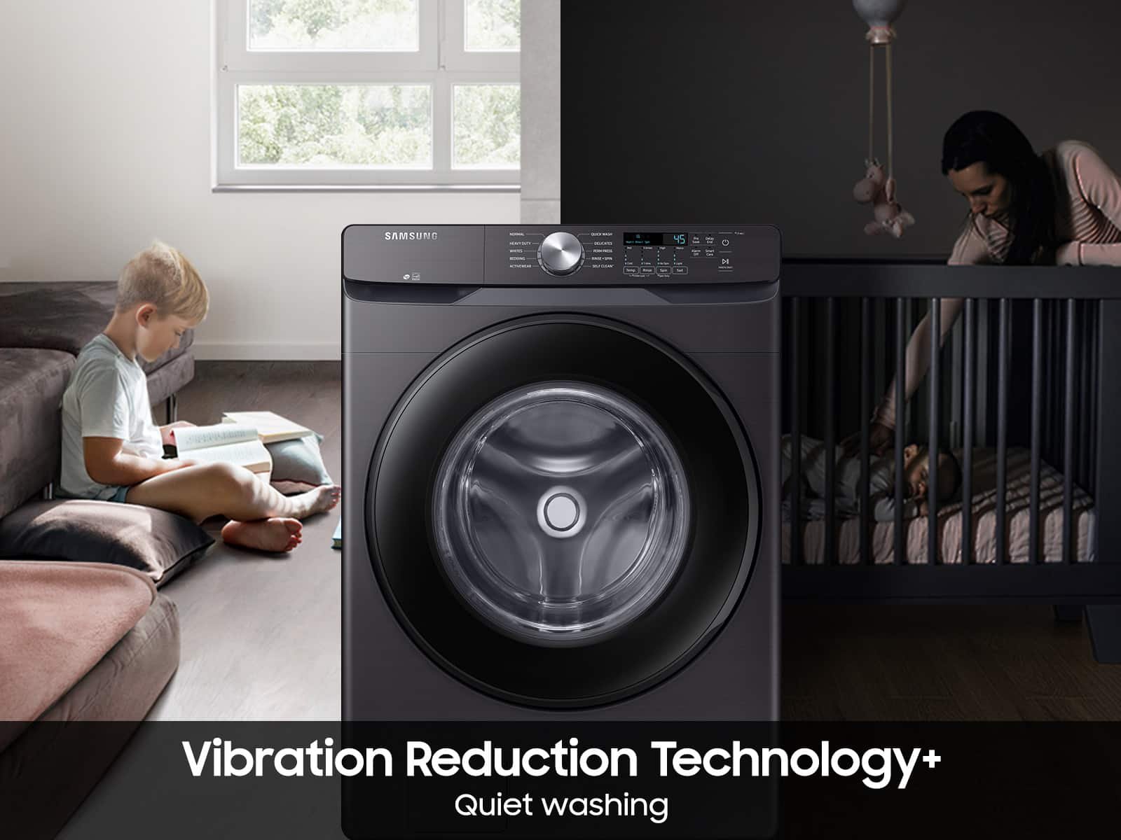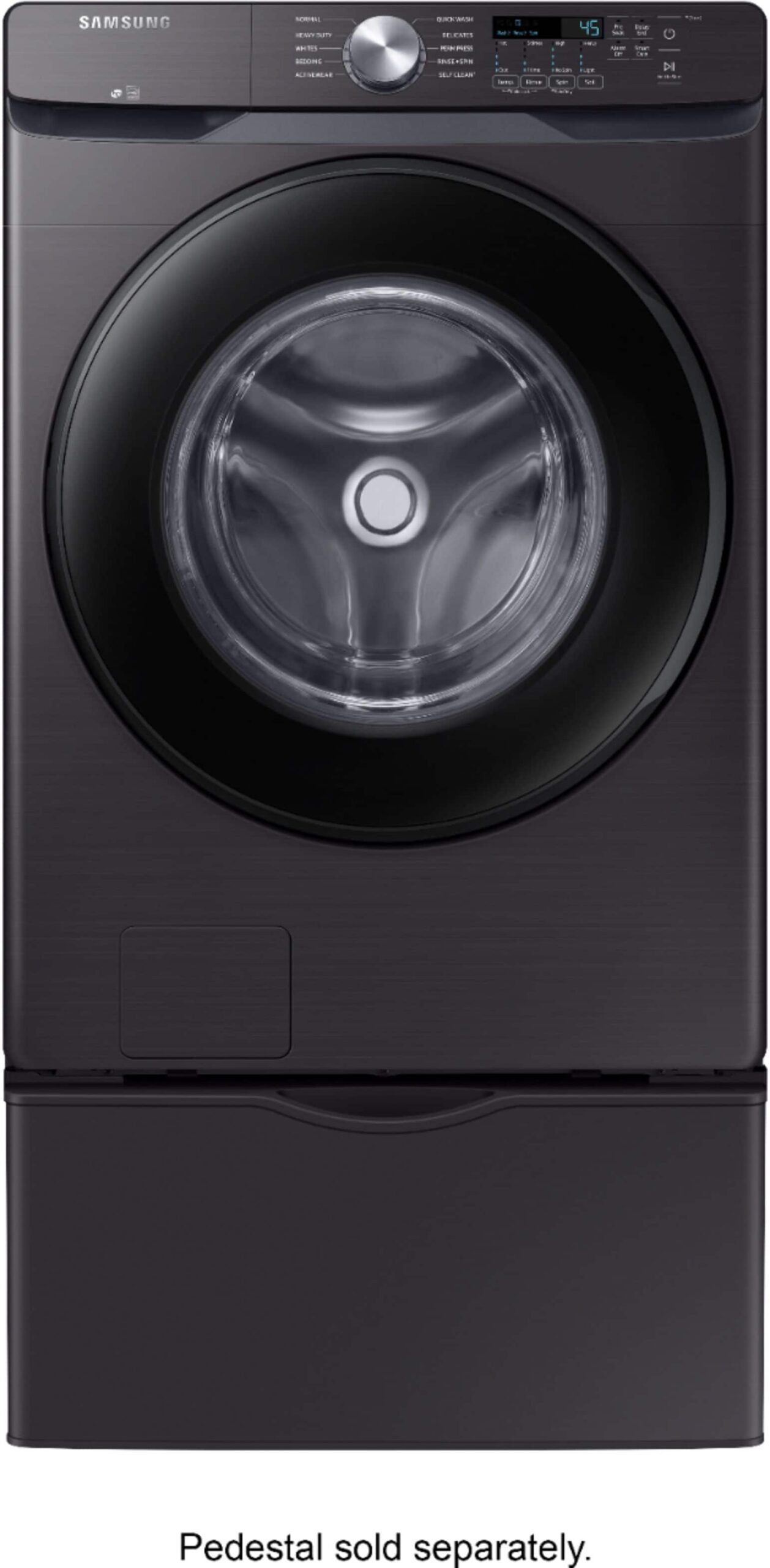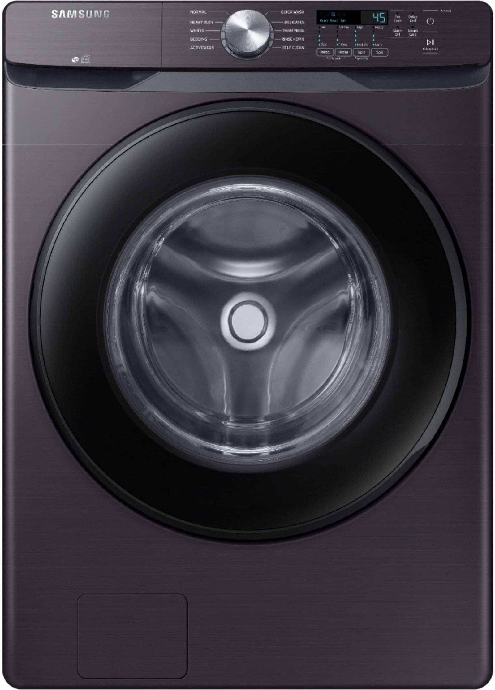 Samsung’s Energy Star Certified Front Load washer has 4.5 cu. ft. capacity to fit more in every load and cut down on laundry time. It is equipped with Vibration Reduction Technology+ to reduce noise for quiet washing and features Self Clean+ to eliminate 99% of bacteria that can form in the drum.(1) **(1)Based on testing by Intertek of the Self Clean+ cycle on the WF6000R.